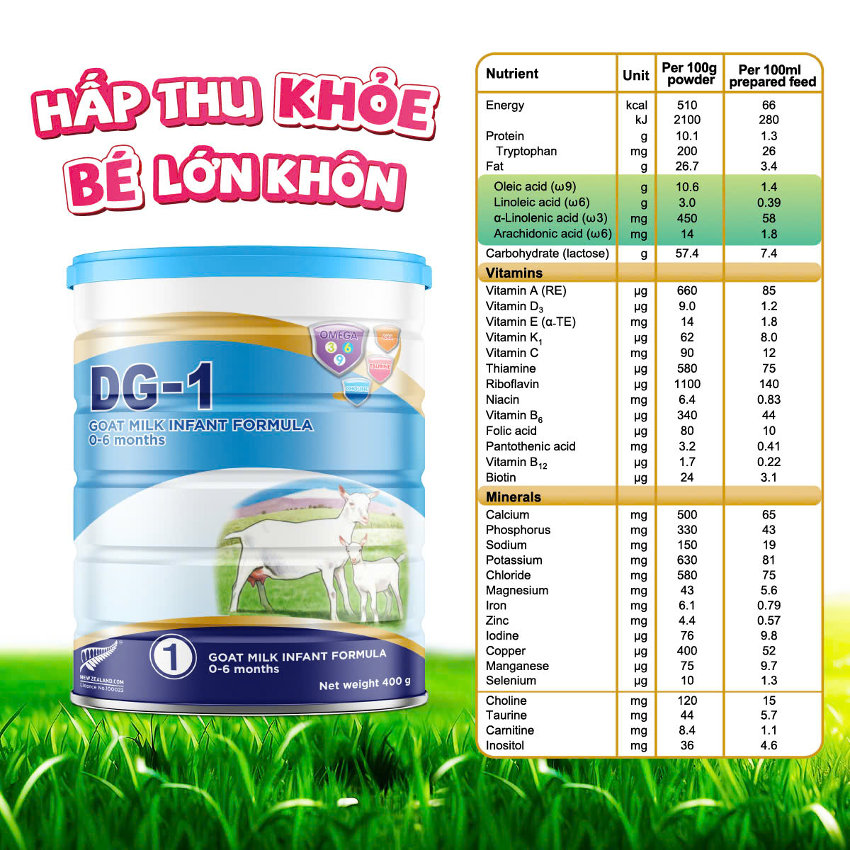 Sữa Dê Công Thức DG-1 đặc biệt dành riêng cho các bé từ 0 đến 6 tháng tuổi.